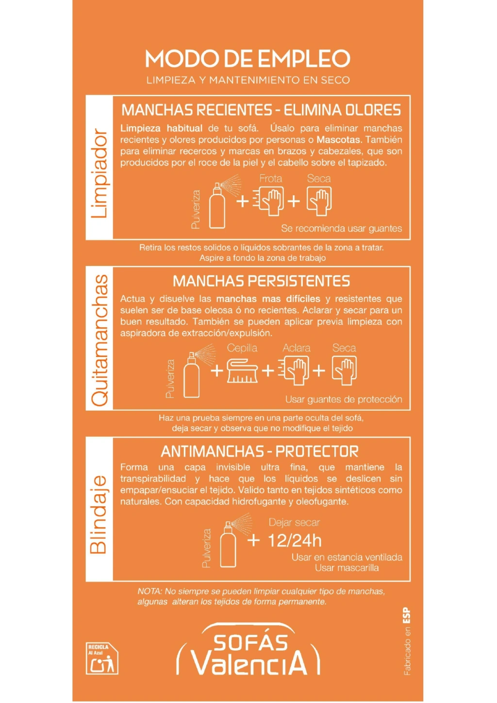 Modo de empleo: Pulverizar las zonas del sofá que deseé blindar. Dejar secar durante 12 o 24 horas sin sentarse en el sofá.