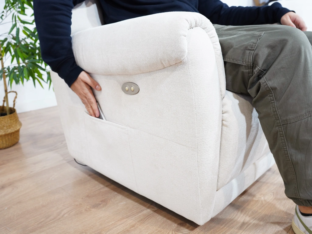 El sillón relax Inés presenta un diseño clásico que no pasa de moda con formas acogedoras que te invitarán a quedarte horas y horas en él. La comodidad está asegurada con la sentada hecha con espuma de 30kg HR y el respaldo de fibra hueca siliconada, que te envuelve la espalda asegurando un confort superior. Hay un bolsillo INCLUIDO en el lateral del sillón. Además, el sillón está pensado para todo tipo de personas y necesidades, ya que al ser fabricantes podemos configurar el sofá con diferentes mecanismos. El sillón base es de palanca americana, al activar esta palanca se abre la parte inferior, pero si quieres cerrarlo también puedes activar la palanca y te ayudará en el movimiento. Podemos configurarlo como sillón relax motorizado, sillón levantapersonas de uno o dos motores. También con mecanismo y estructura especial para gente que pesa más de 120kg.