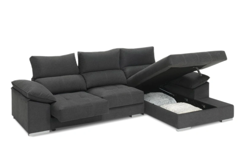 El sofá chaise longue Denia destaca por su arcón GRATIS en el chaise longue. La comodidad no se queda en segundo plano, ya que sus asientos son de espuma de calidad y el respaldo mullido posicional. Además sus asientos son extraíbles. Los brazos almohadilla son ideales para tumbarse y apoyar la cabeza.