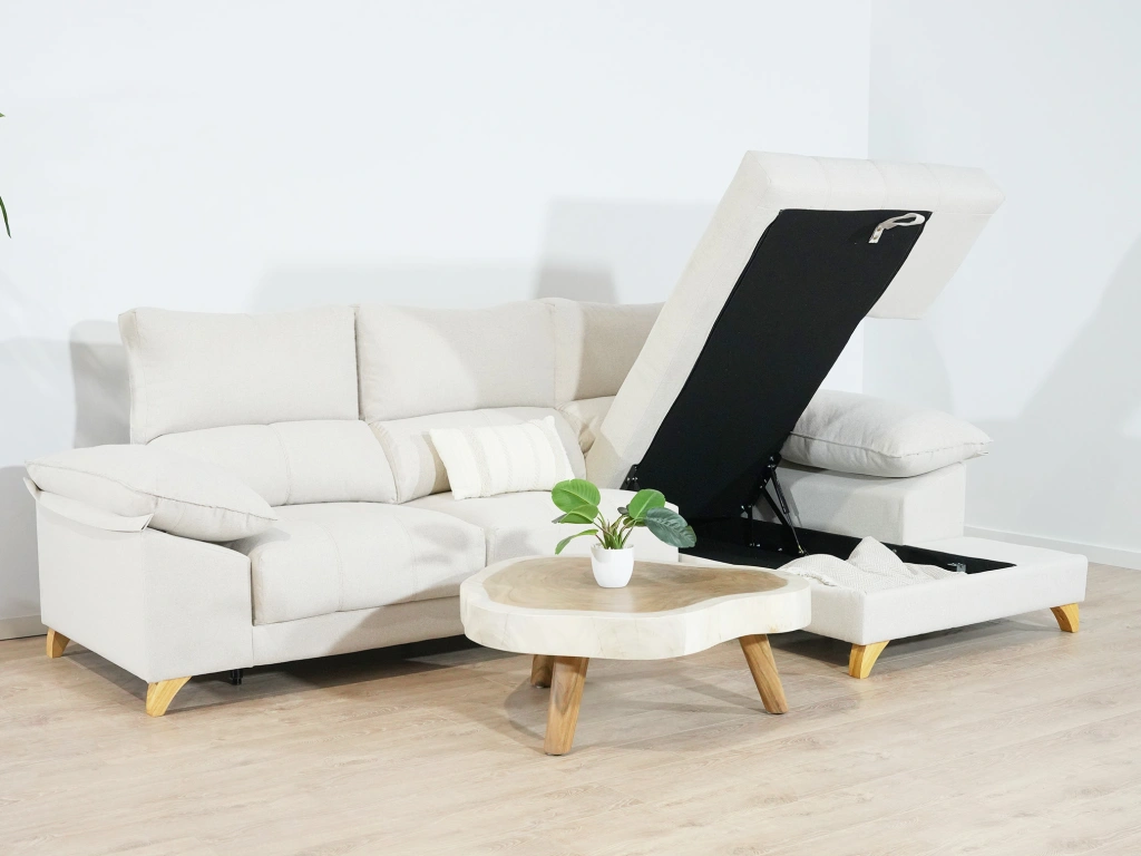 ¿3-7 días de envío un sofá fabricado en España? Sí, en Sofás Valencia te lo envíamos de nuestra fábrica a tu casa. Nuestro sofá chaise longue Río con envío express. Fabricado con materiales de calidad. Los asientos son de espuma de 30KG HR proporcionando una sentada suave. También son extraíbles en varias posiciones para hacer el sofá más fondo cuando consideres necesario. El chaise longue incluye un arcón de gran capacidad para guardar todo tipo de objetos. Sus cabeceros son reclinables y los brazos de almohadilla. Los cabeceros Los 10 centímetros de altura de las patas de madera permiten que el robot aspirador pase por bajo del sofá y logran una amplitud visual para el salón.