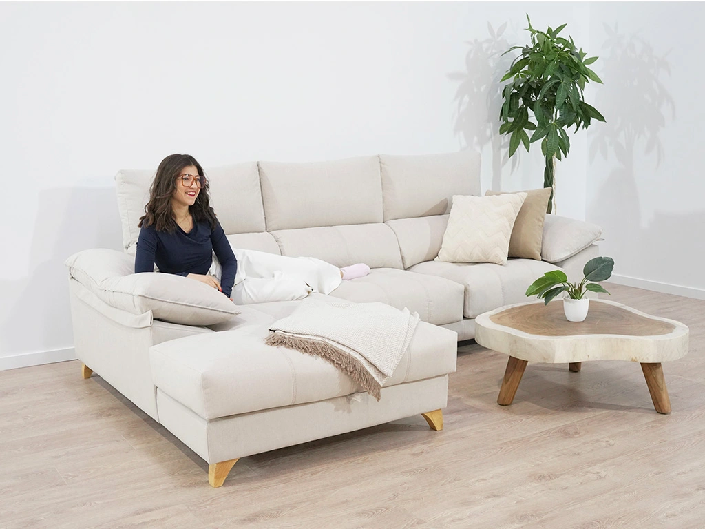 Chaiselongue Río es un sofá chaise longue con tapizado ENZO Natural 01 y patas altas de 10 cm, que ofrece una sentada profunda mullida gracias a su espuma de 30 kg HR y asientos extraíbles en varias posiciones. Incluye un arcón GRATUITO en el chaise para guardar objetos y un respaldo posicional para adaptar la comodidad. Su estructura de madera maciza aporta alta resistencia y facilita la limpieza al quedar elevado. El plazo de entrega para este modelo es de 3-7 días con el envío es express.