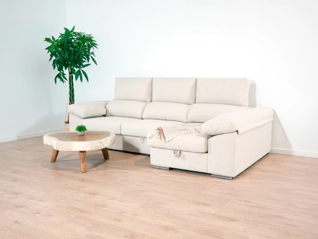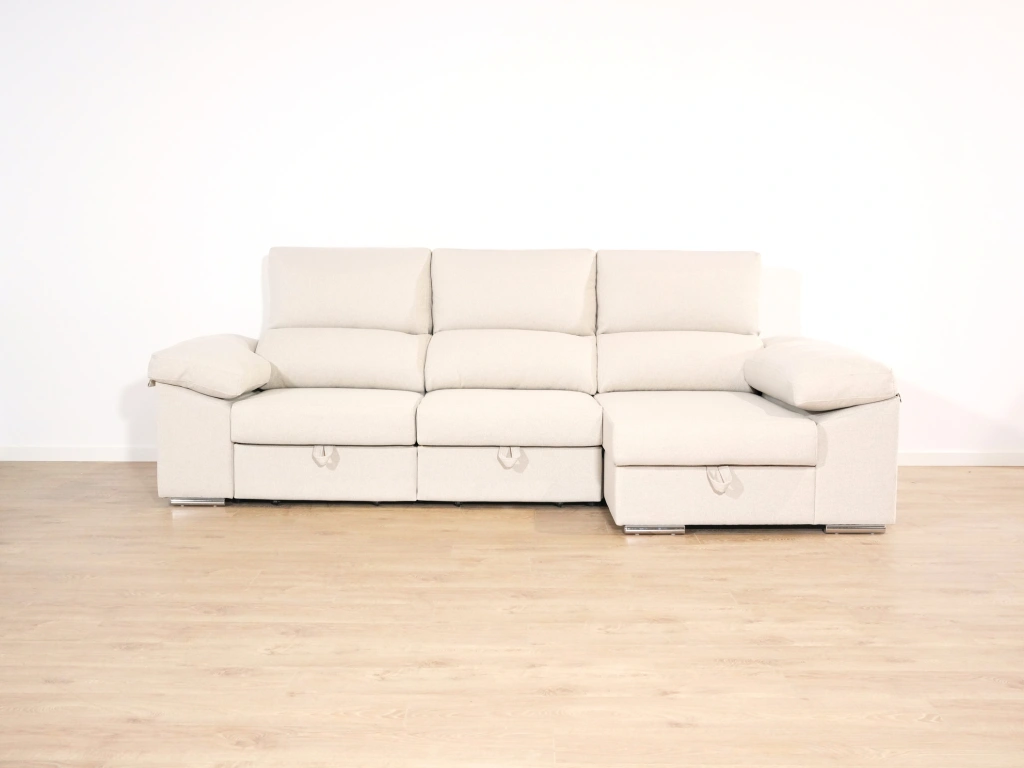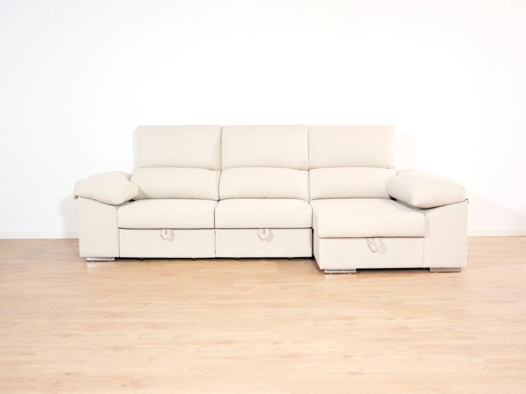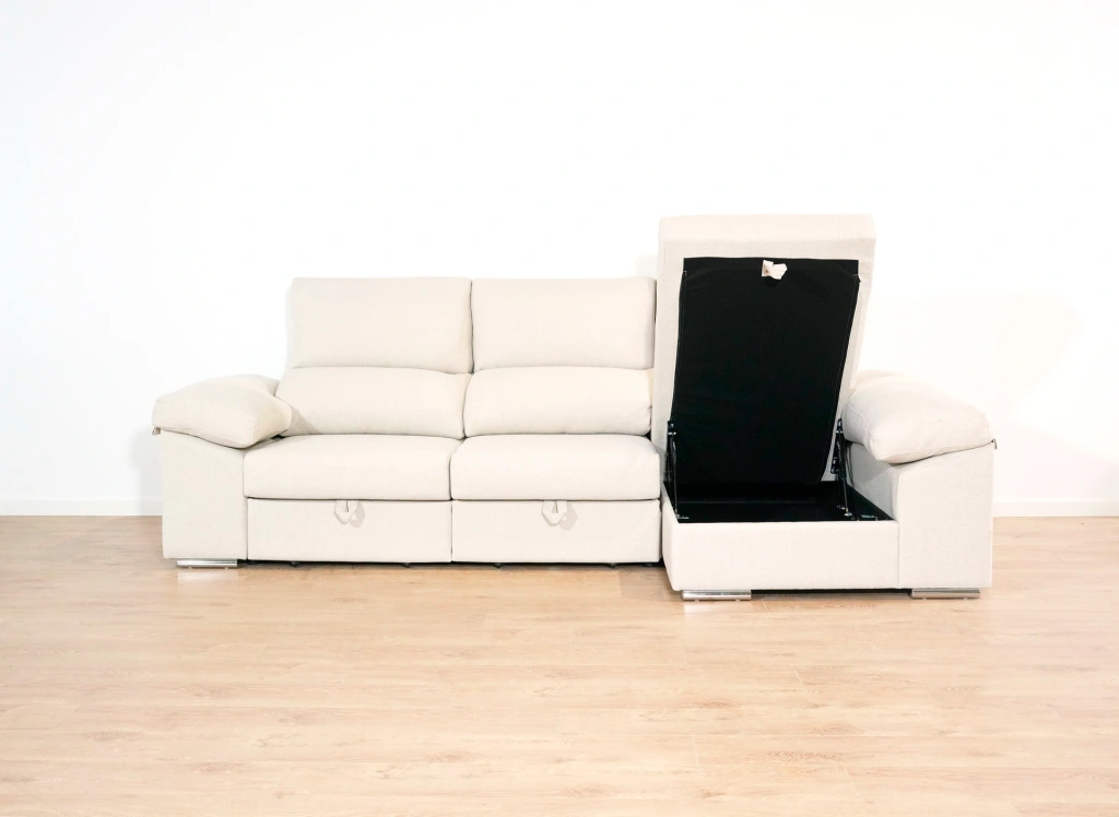 El chaise longue Tarragona es uno de los sofás más completos. Cuenta con un arcón GRATIS en el chaise longue aportando un gran espacio de almacenamiento para todo tipo de objeto. Además, sus asientos extraíbles con apoyo al suelo aportan comodidad y estabilidad. Todo esto sin dejar de lado comodidad, que no se queda atrás gracias a sus brazos mullidos y su espuma de calidad.