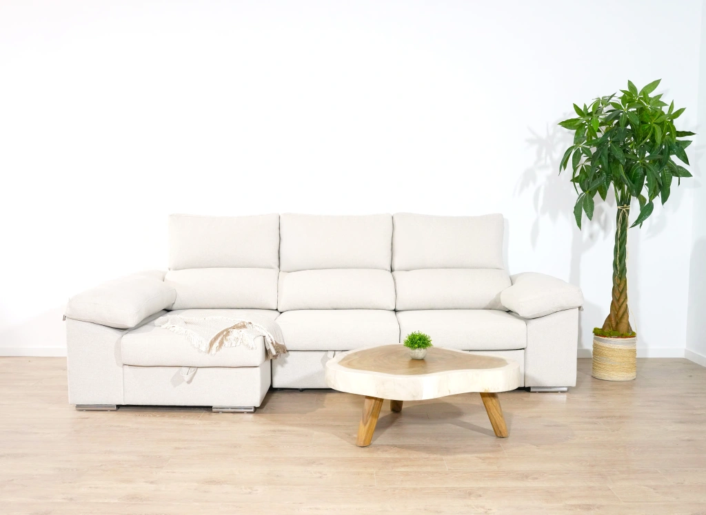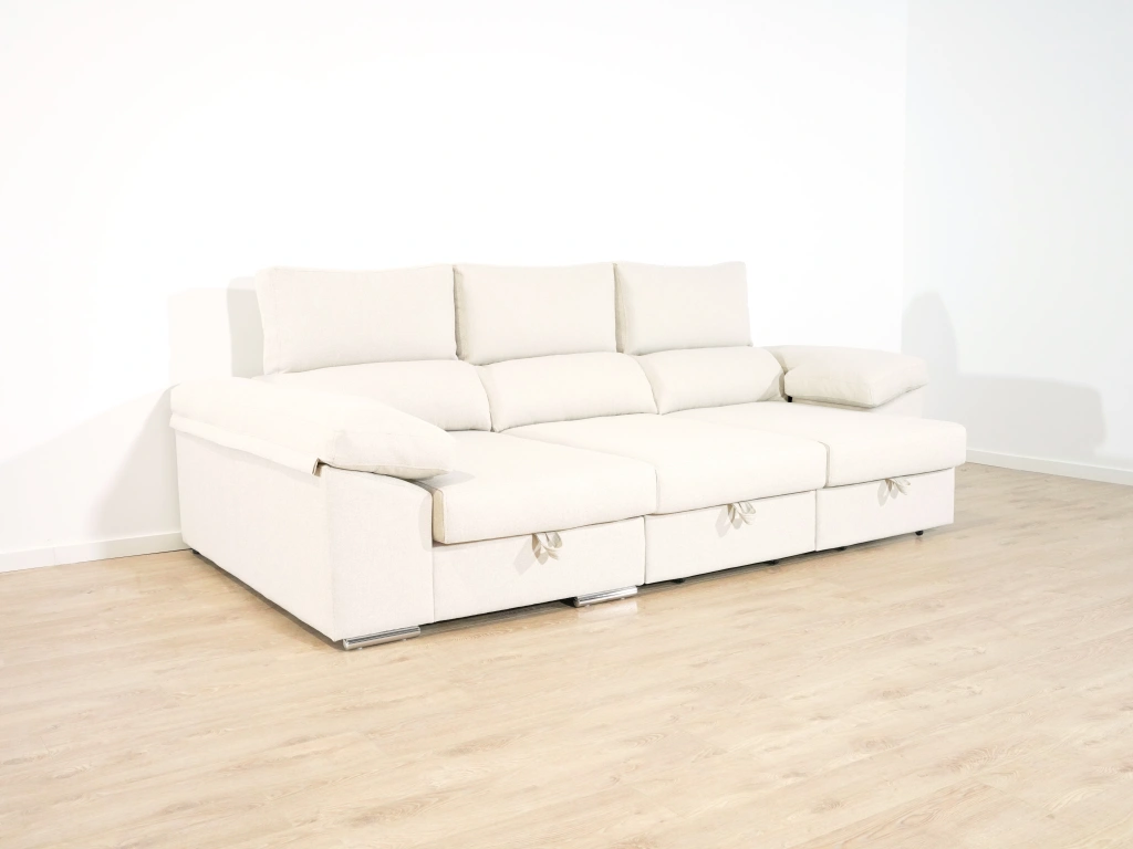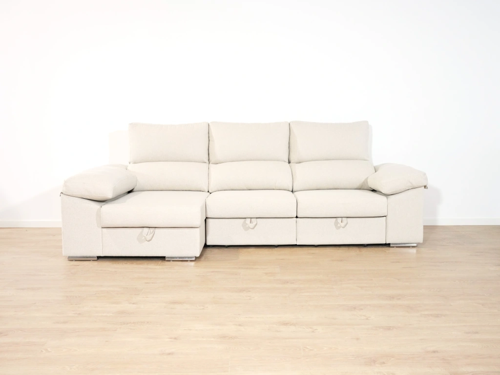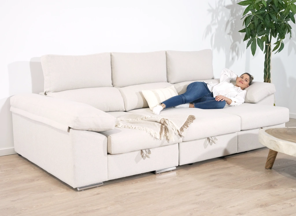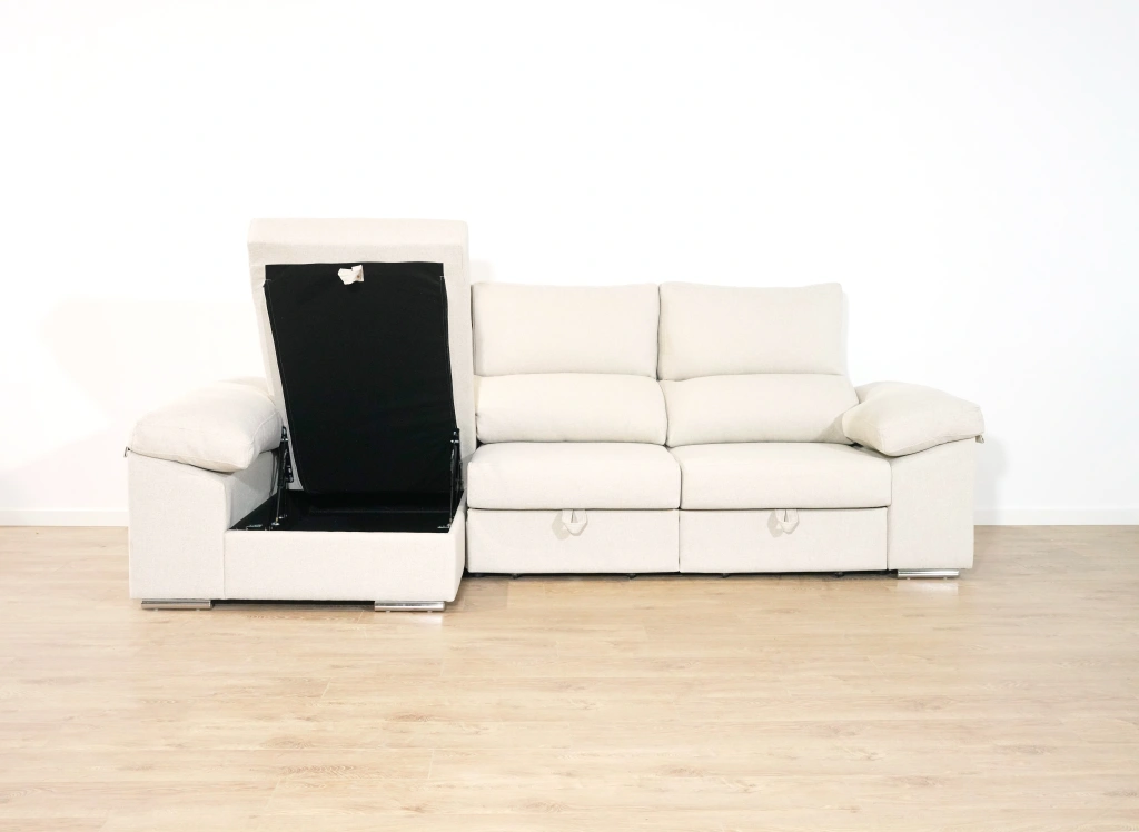 El chaise longue Tarragona es uno de los sofás más completos. Cuenta con un arcón GRATIS en el chaise longue aportando un gran espacio de almacenamiento para todo tipo de objeto. Además, sus asientos extraíbles con apoyo al suelo aportan comodidad y estabilidad. Todo esto sin dejar de lado comodidad, que no se queda atrás gracias a sus brazos mullidos y su espuma de calidad.