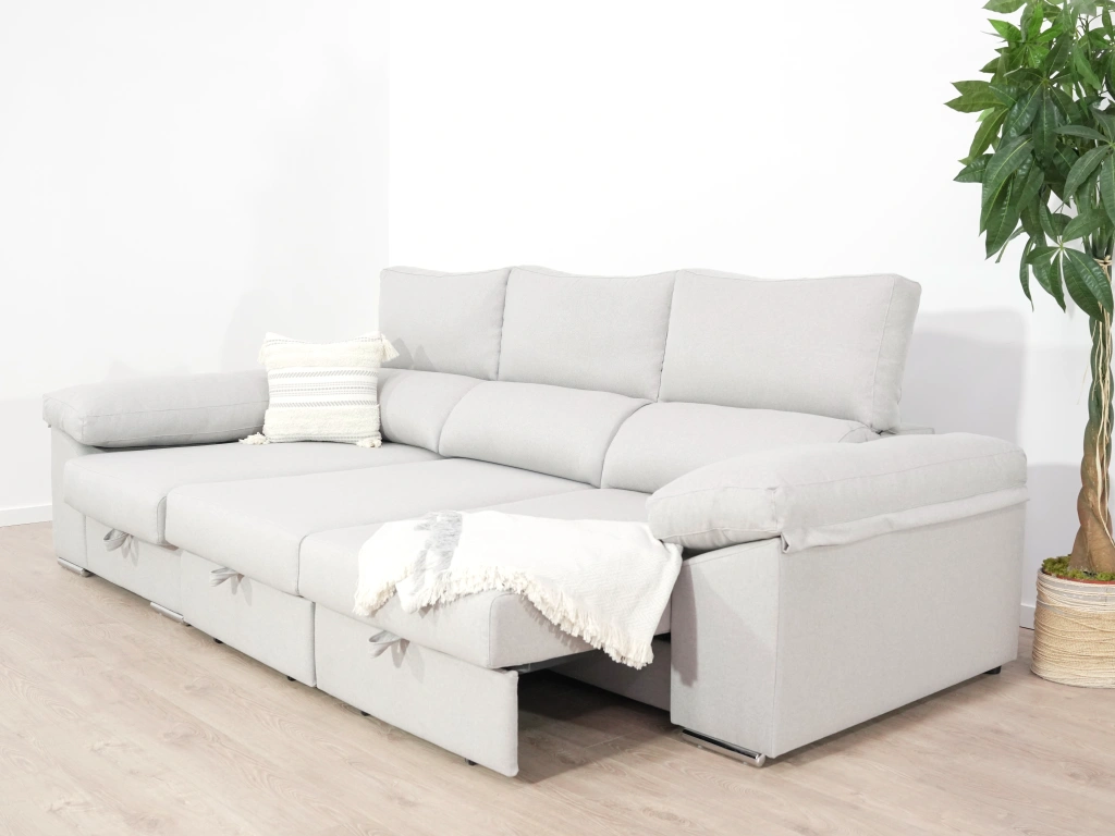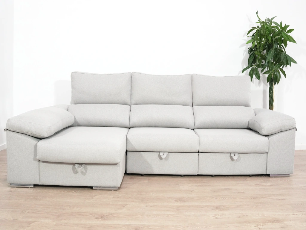 El chaise longue Tarragona es uno de los sofás más completos. Cuenta con un arcón GRATIS en el chaise longue aportando un gran espacio de almacenamiento para todo tipo de objeto. Además, sus asientos extraíbles con apoyo al suelo aportan comodidad y estabilidad. Todo esto sin dejar de lado comodidad, que no se queda atrás gracias a sus brazos mullidos y su espuma de calidad.