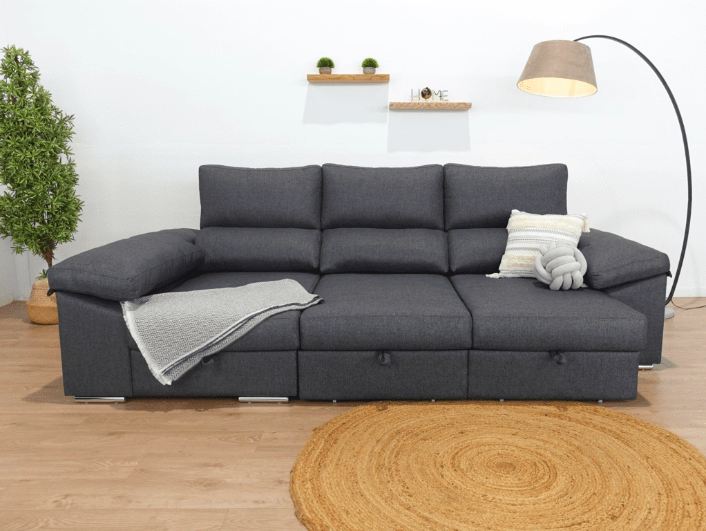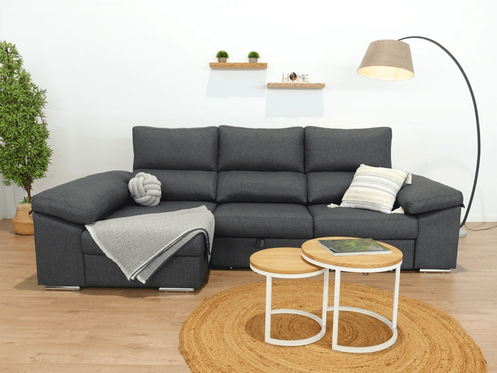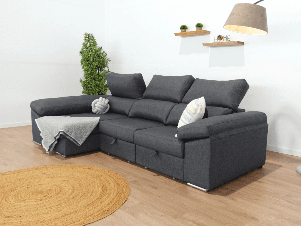 El chaise longue Tarragona es uno de los sofás más completos. Cuenta con un arcón GRATIS en el chaise longue aportando un gran espacio de almacenamiento para todo tipo de objeto. Además, sus asientos extraíbles con apoyo al suelo aportan comodidad y estabilidad. Todo esto sin dejar de lado comodidad, que no se queda atrás gracias a sus brazos mullidos y su espuma de calidad.