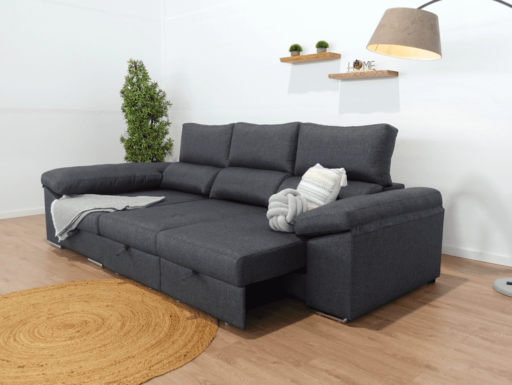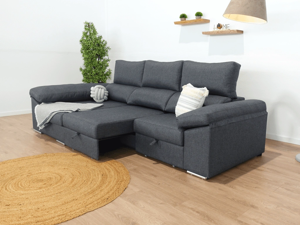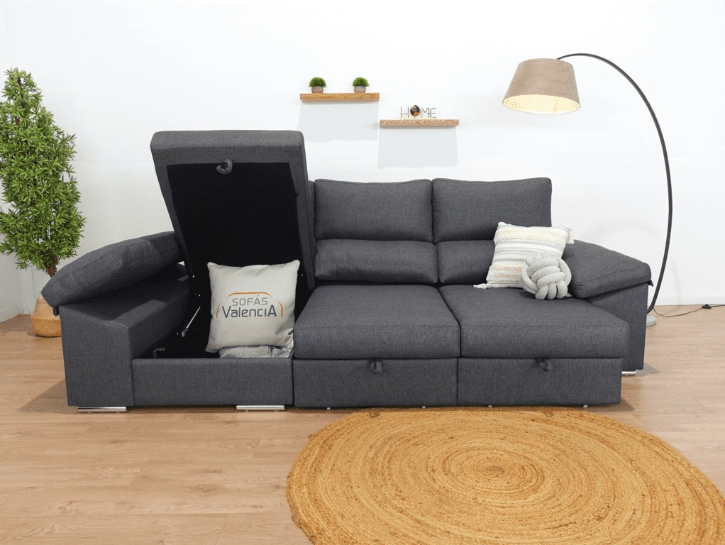 El chaise longue Tarragona es uno de los sofás más completos. Cuenta con un arcón GRATIS en el chaise longue aportando un gran espacio de almacenamiento para todo tipo de objetos. Además, sus asientos extraíbles con apoyo al suelo aportan comodidad y estabilidad. Todo esto sin dejar de lado comodidad , que no se queda atrás gracias a sus brazos mullidos y su espuma de calidad.