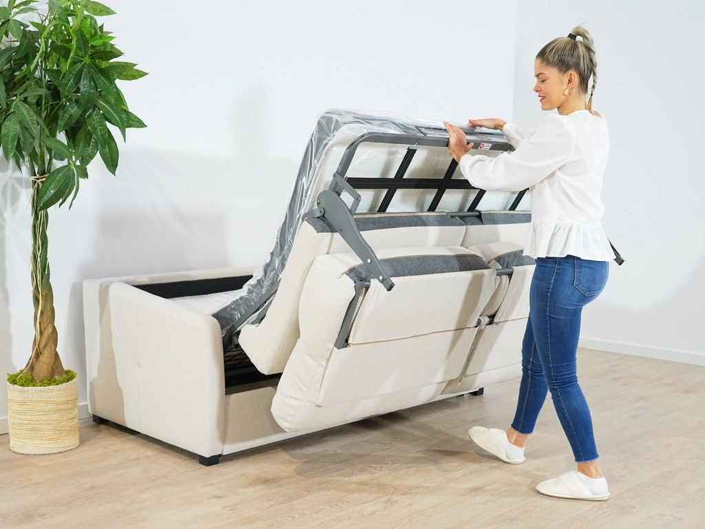 El Sofá Cama Modelo Dora destaca por su colchón de viscoelástica de medida 140cm x190cm y su grosor de 15 cm.