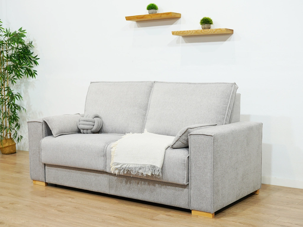 El sofá cama Plan A está hecho con espuma de 30kg suave y su colchón es de 18 centímetros de grosor, aportando la máxima comodidad. Las patas bajas de madera aseguran una resistencia máxima y sus brazos rellenos de fibra serán tu mejor aliado para hacer la siesta o acostarte a la larga.