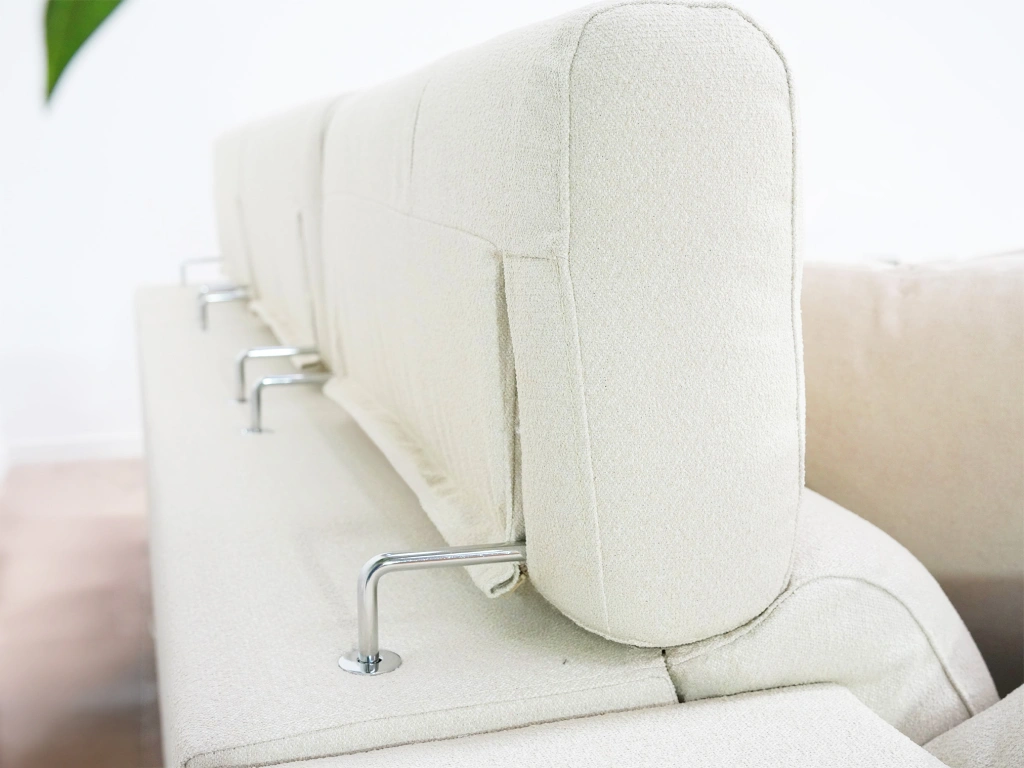 El respaldo de este sofá es único. Ideal para gente con dolores de espalda. Su riñonera, en la que apoyamos la espalda, es de fibra hueca y la sensación de apoyo es inmejorable. El cabecero es posicional con mecanismo de carraca lo cual nos aporta múltiples posiciones para personalizar totalmente la posición.