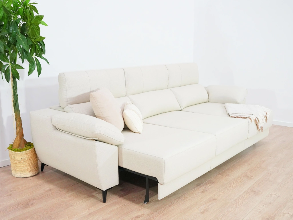 Sofá de alta resistencia gracias a su estructura de madera maciza de pino. Las guías correderas de aluminio con rodamientos son de alta calidad, facilitando la apertura de los asientos.