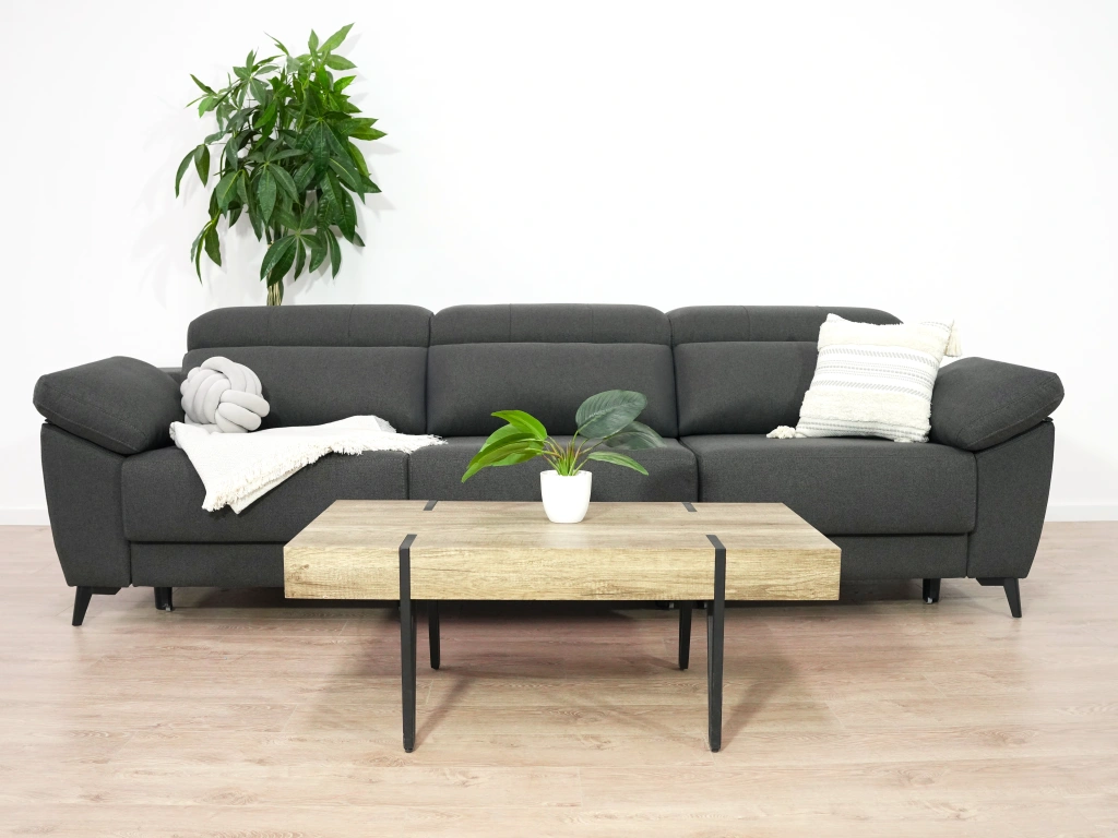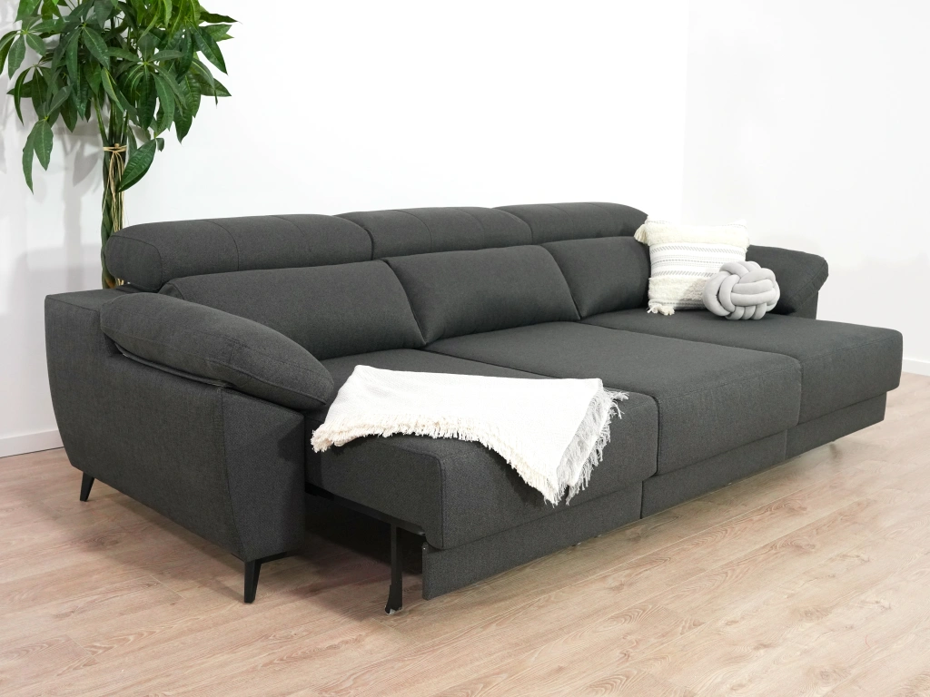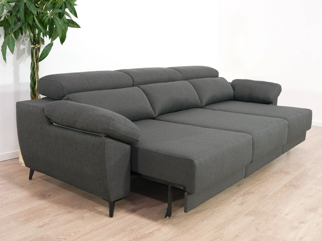 Sofá de alta resistencia gracias a su estructura de madera maciza de pino. Las guías correderas de aluminio con rodamientos son de alta calidad, facilitando la apertura de los asientos.